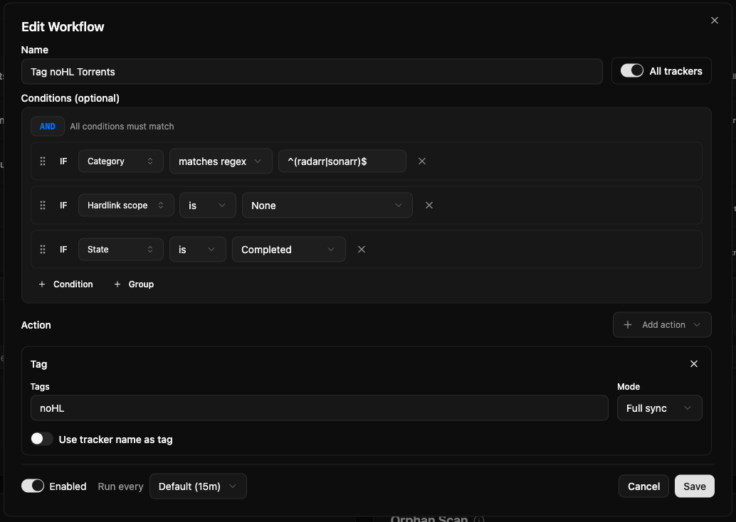 Create a new rule, and name the workflow ‘Tag noHL Torrents’.