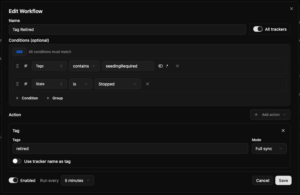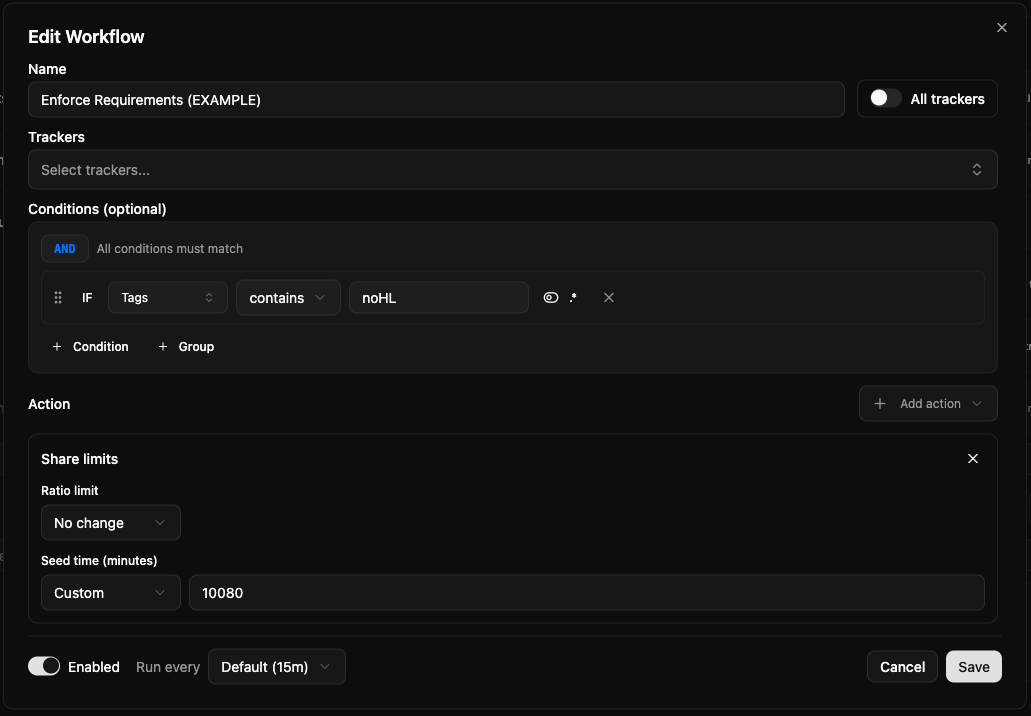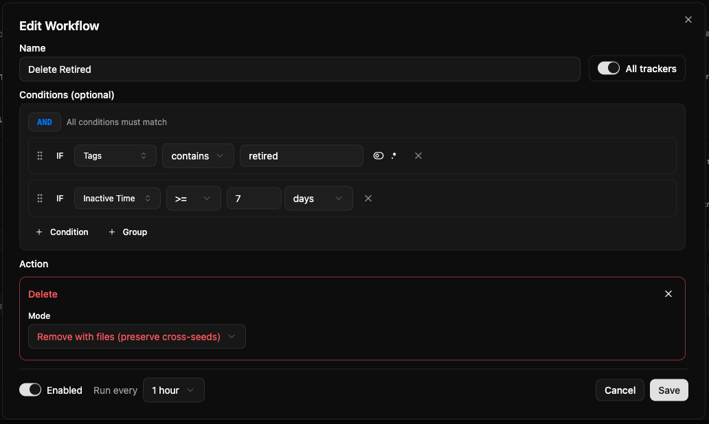 Finally, for each workflow you specify how often you want it to run. This is how often Qui will check your torrents for matches to the workflow, and perform the specified action on them.