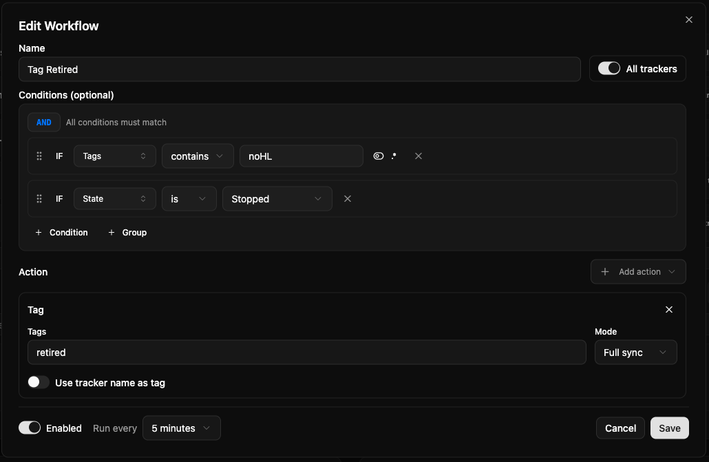 Create a new rule, apply it to all trackers, and name the workflow ‘Tag Retired’.