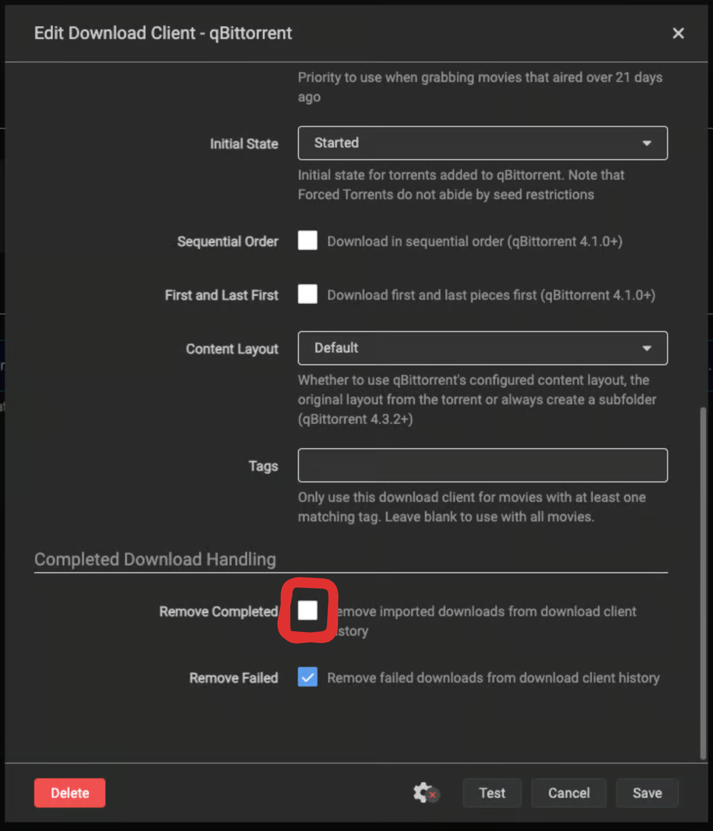 Radarr and Sonarr both have built in features that can automatically remove stopped torrents they have imported. We DO NOT want this enabled, as it will unexpectedly and silently interfere with any workflows we may create.